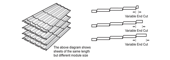A variable end cut can be provided where a fixed module size is required to suit the design to eliminate the need to trim the roofing sheet at the ridge. |